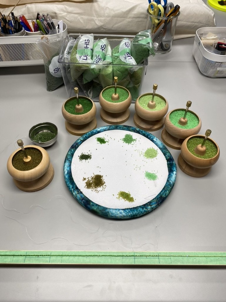 Much of my studio time has been thinking and planning the next few months. I have two studio assistants who have been helping me with the grass work. We are currently working on some sculptural beadworks that will be displayed on the wall with 5’ long fringe. These fringes are so time consuming. One fringe takes me about 30 minutes to make, so my studio assistants, Kate and Anna, will be helping me tackle these so they are ready in time for the Grande Prairie exhibition. I’m kind of dreading the next few months making these but I’m also super excited to see them come together. This project is supported by Arts Nova Scotia and Canada Council for the Arts.